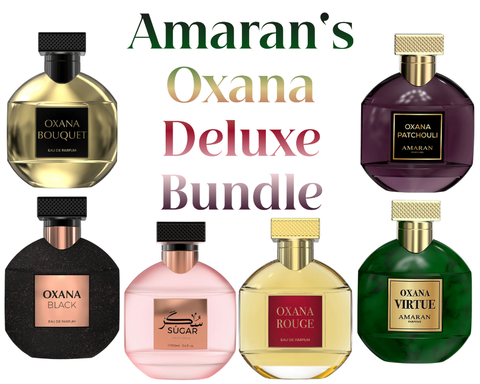 - A women's fragrance bundle that contains Oxana Sugar, Oxana Black, Oxana Rouge, Oxana Virtue, Oxana Patchouli, and Oxana Bouquet by Amaran