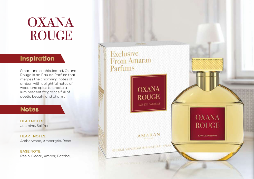 Smart and sophisticated, Oxana Rouge is an Eau de Parfum that merges the charming notes of amber, with delightful notes of wood and spics to create a luminescent fragrance full of poetic beauty and charm.