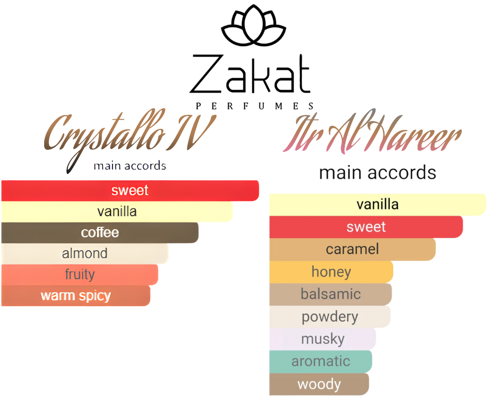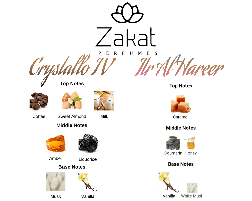 - A sweet caramel and coffee gourmand bundle that includes the eau de parfum Crystallo Collection IV by Zakat and the fragrance oil Itr Al Hareer by Zakat