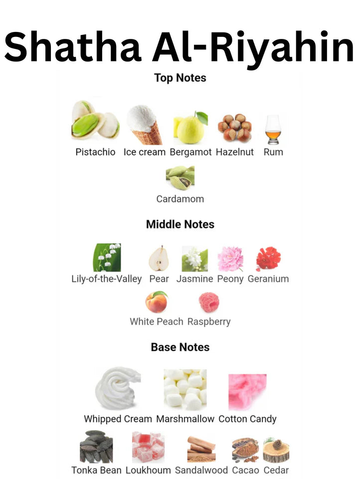 - Top Notes: Pistachio, Ice cream, Bergamot, Hazelnut, Rum and Cardamom