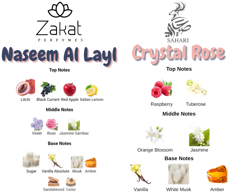 - A fruity sweet fragrance bundle that comes with the eau de parfum Crystal Rose by Sahari and the fragrance oil Naseem Al Layl by Zakat