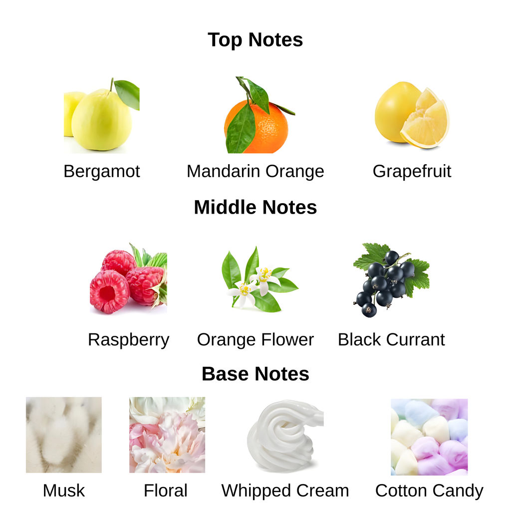 - Base Notes: Musk, Floral, Cotton Candy, Whipped Cream