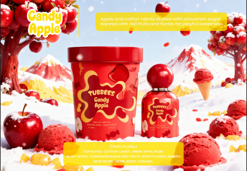 Indulge in Tubbees Candy Apple by Grandeur. This unique fragrance combines the crispness of apples and the sweetness of cotton candy, dusted with cinnamon sugar for a playful twist. Layered with red fruits and delicate florals, this scent will leave you feeling sweet and playful all day long.
