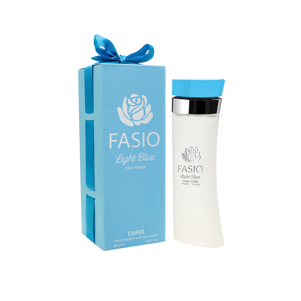 EMPER FASIO Light Blue Perfume For Women 100ml perfume aroma starts with juicy notes of Sicilian lemons and crisp apples. This refreshing fruit duo is instantly complemented by sensual and soft cedar colors and the carefree sweetness of cauldrons.